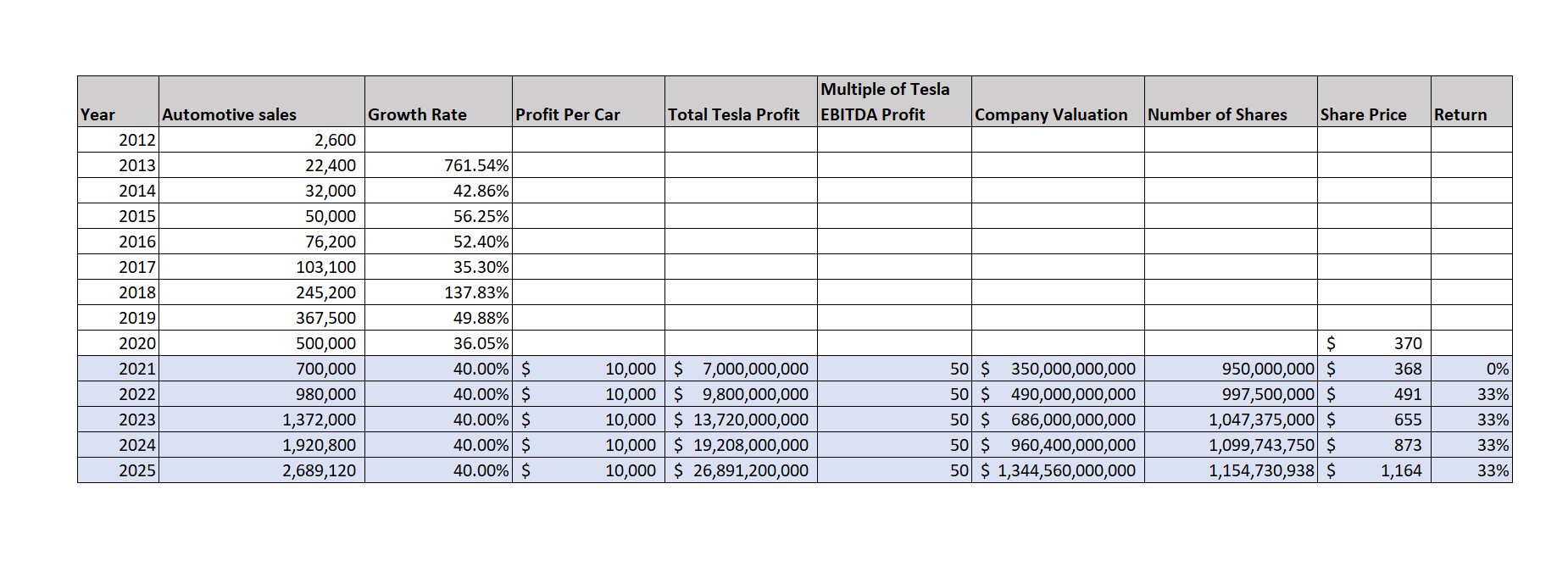 1- A forecast for the number of cars Tesla makes and sells based on a 40% annual growth rate.